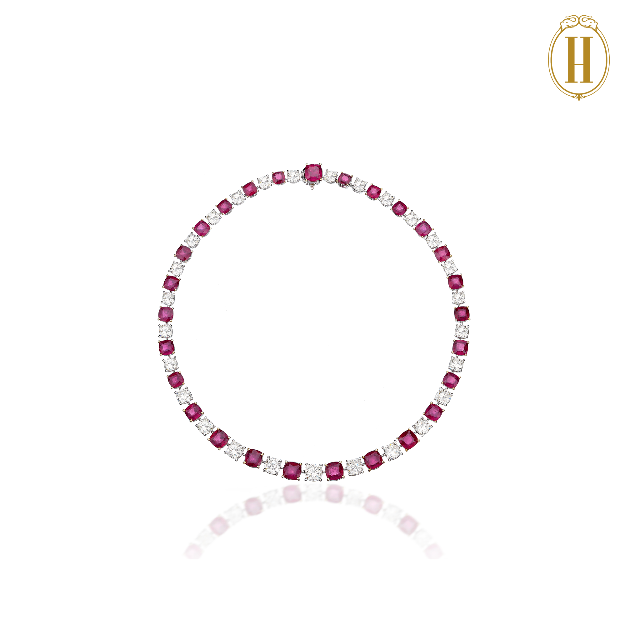 Rubies, associated with love and passion, add a fiery and bold statement to any piece. Legacy Cushion Cut Rubies and Diamonds Necklace is a unique composition of cushion cut rubies and brilliant-cut diamonds set in 18KT white gold.