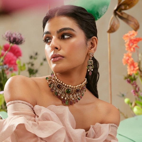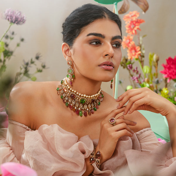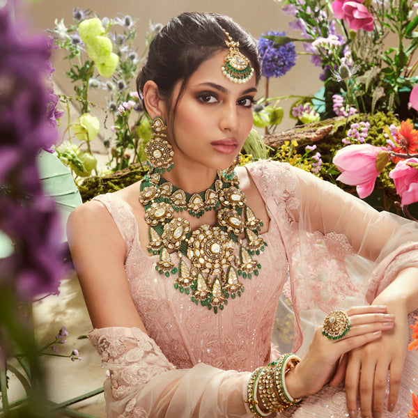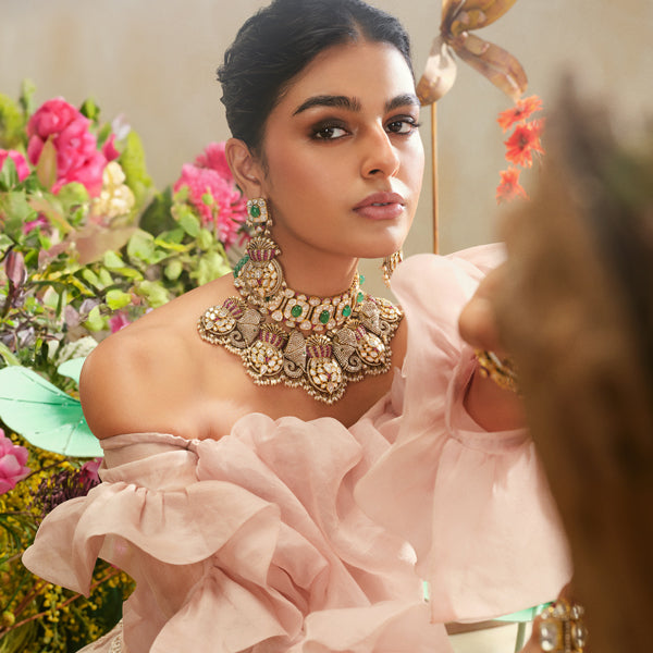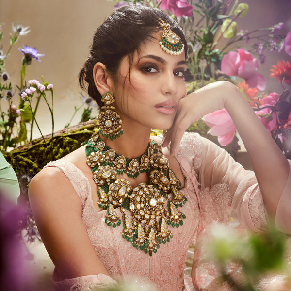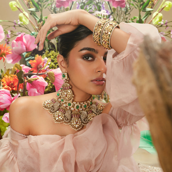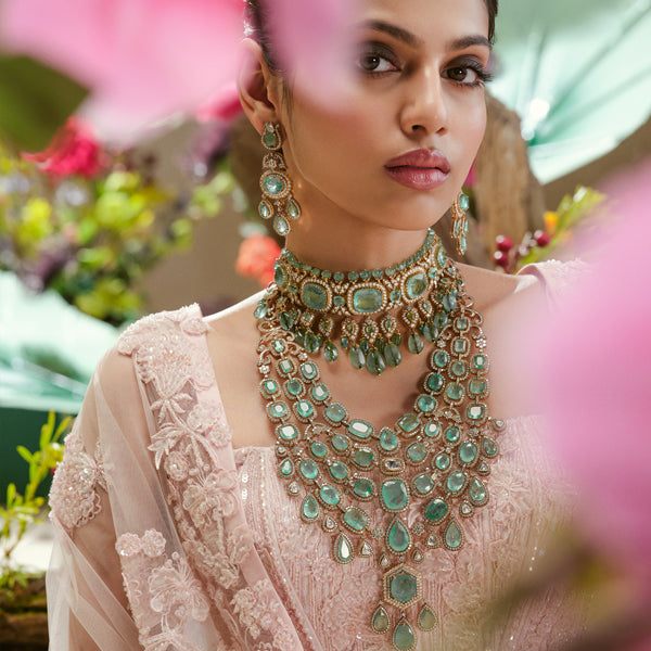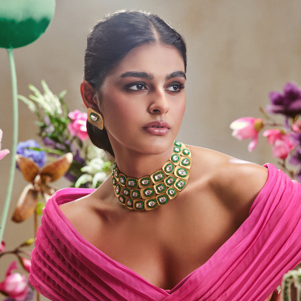 Inspired by the historic Blue Mosque of Istanbul, the Mihrab collection in gold, with its intricate motifs and pastel-hued enamel work, is an ode to the Persian art and architecture. The ‘meenakari’ craftsmanship is accentuated by the warm glow of 22 karat gold that sets off the colors beautifully. Culturally rich and unique, the Mihrab jewellery ties an enduring art form with novel designs.