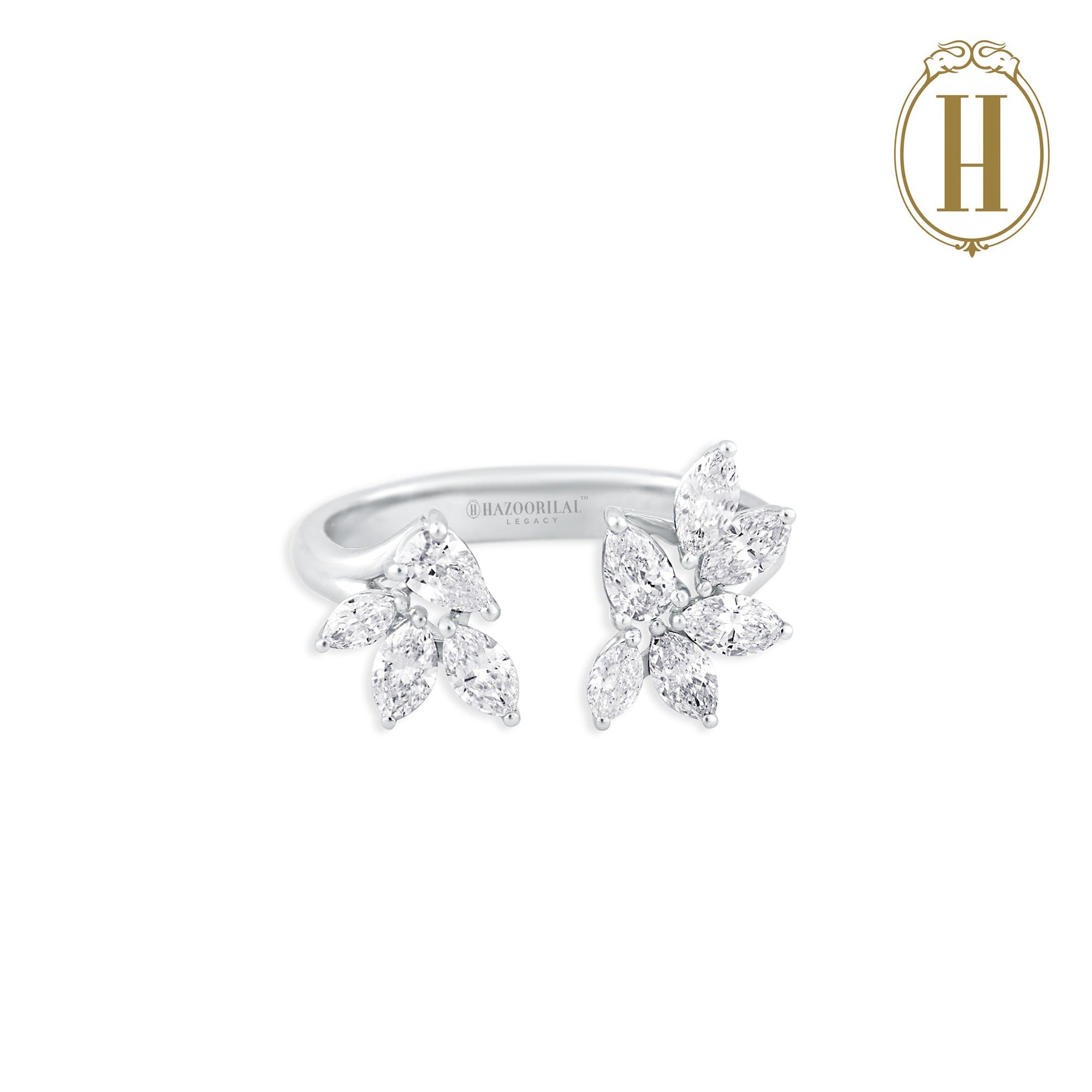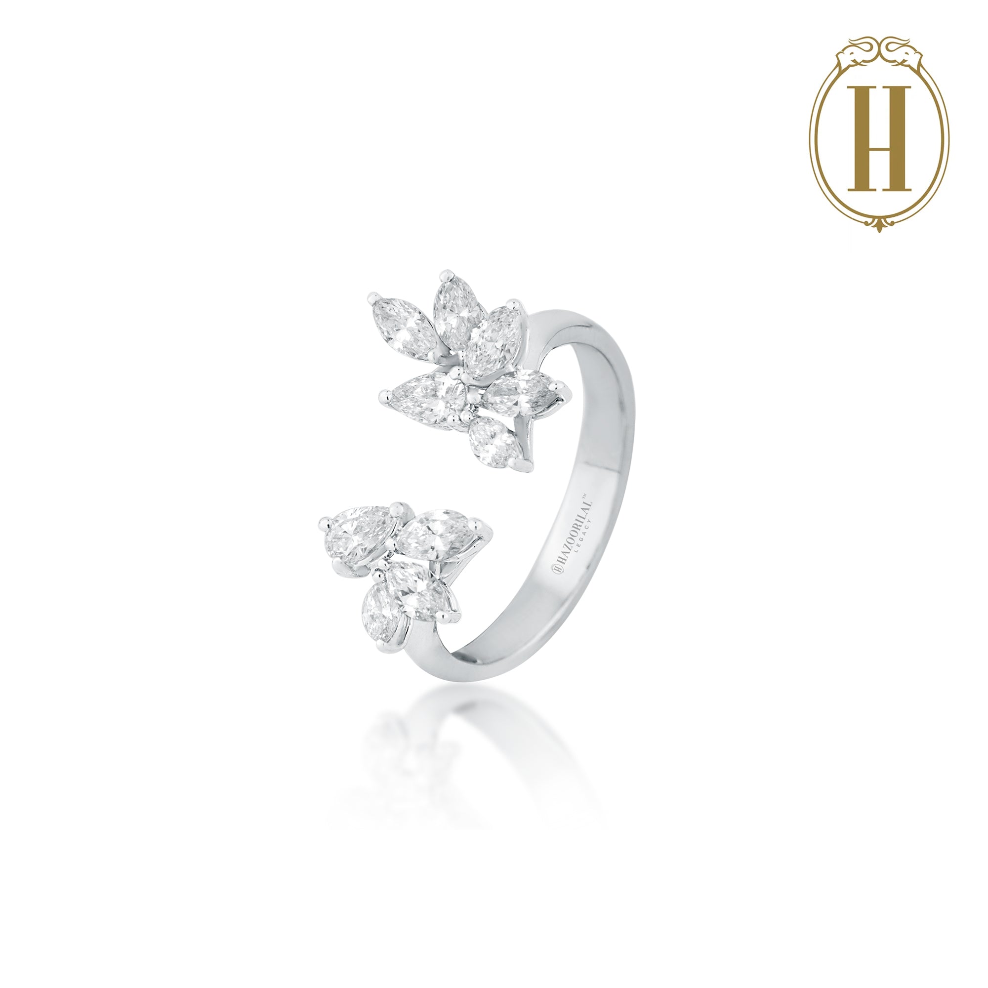 18 kt white gold ring featuring a unique array of fancy-shaped diamonds