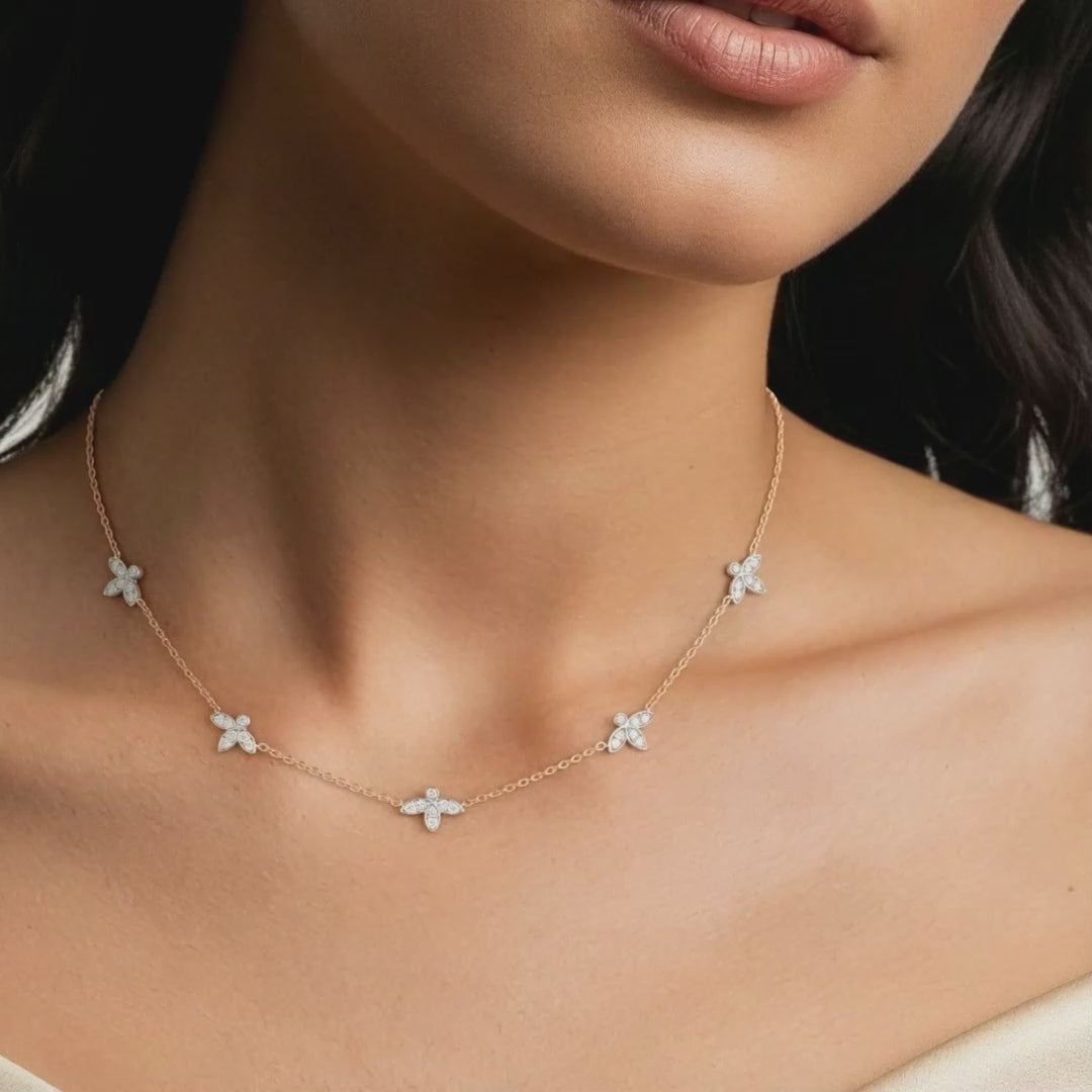 18 Kt yellow gold necklace with floral motifs highlighted by round brilliant-cut diamonds