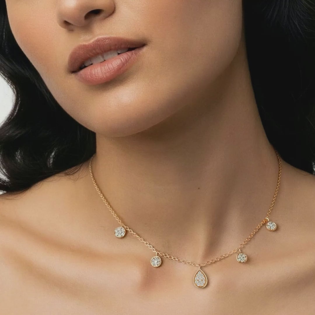 18 Kt yellow gold necklace with pear and round shaped drops, showcasing round brilliant-cut diamonds