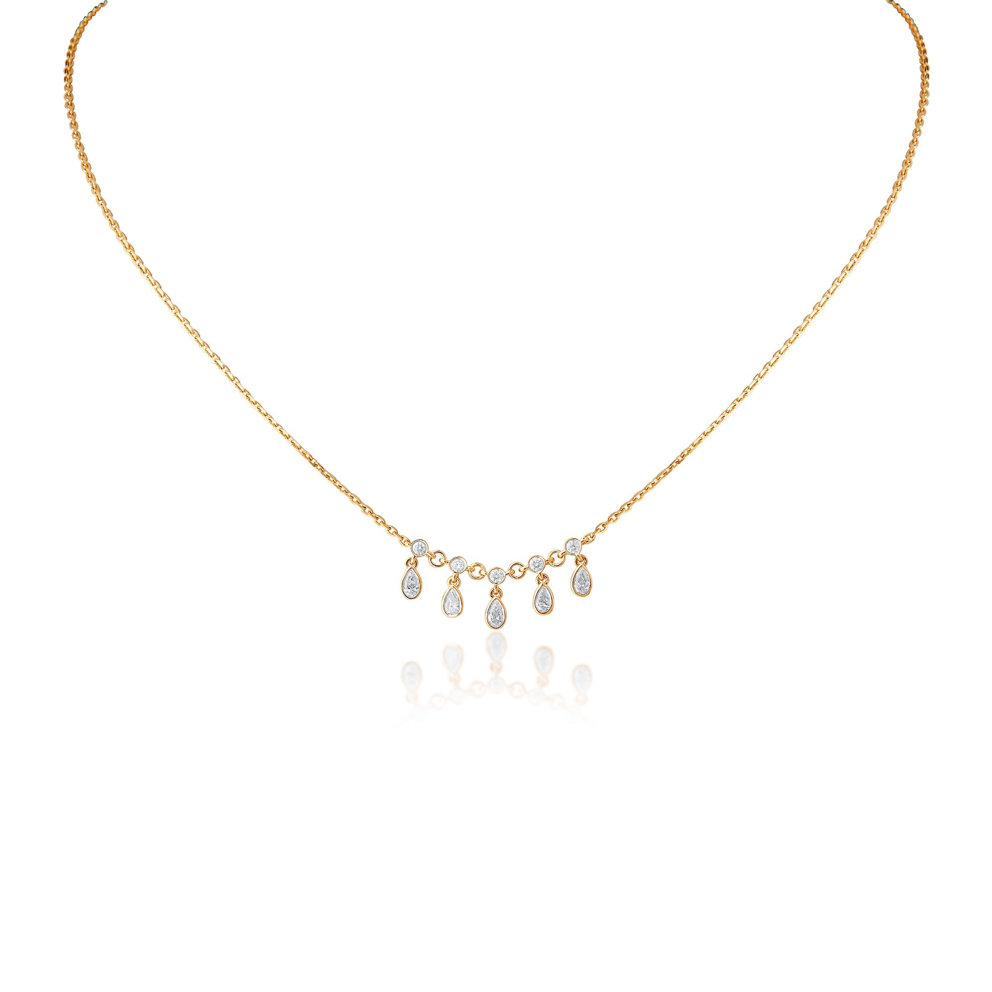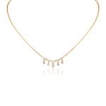18 KT yellow gold necklace with round brilliant cut diamonds and pear shape diamonds drops.