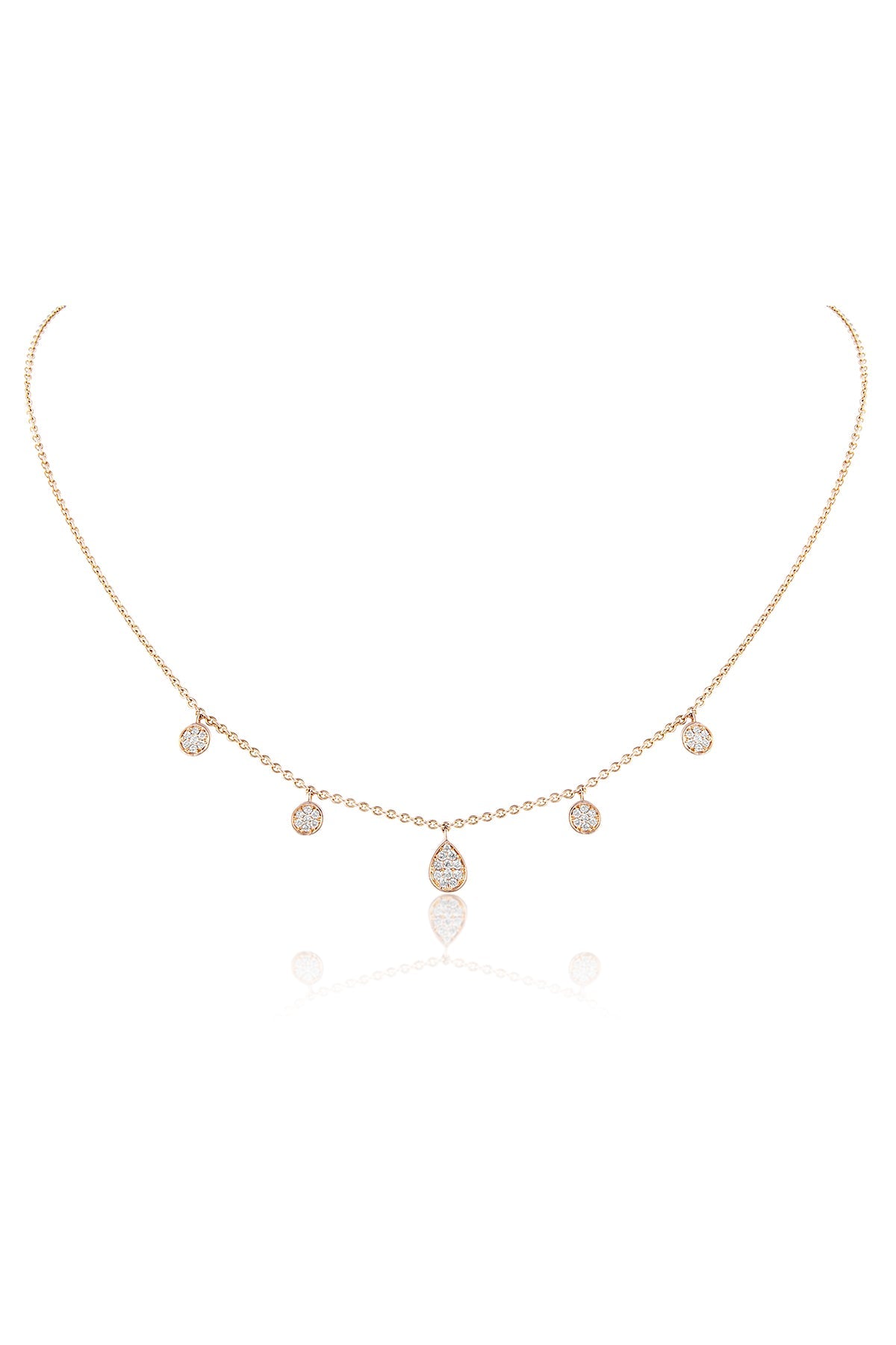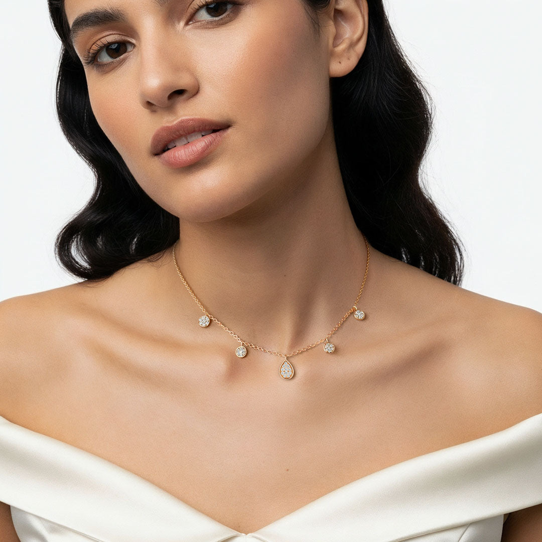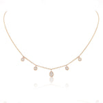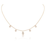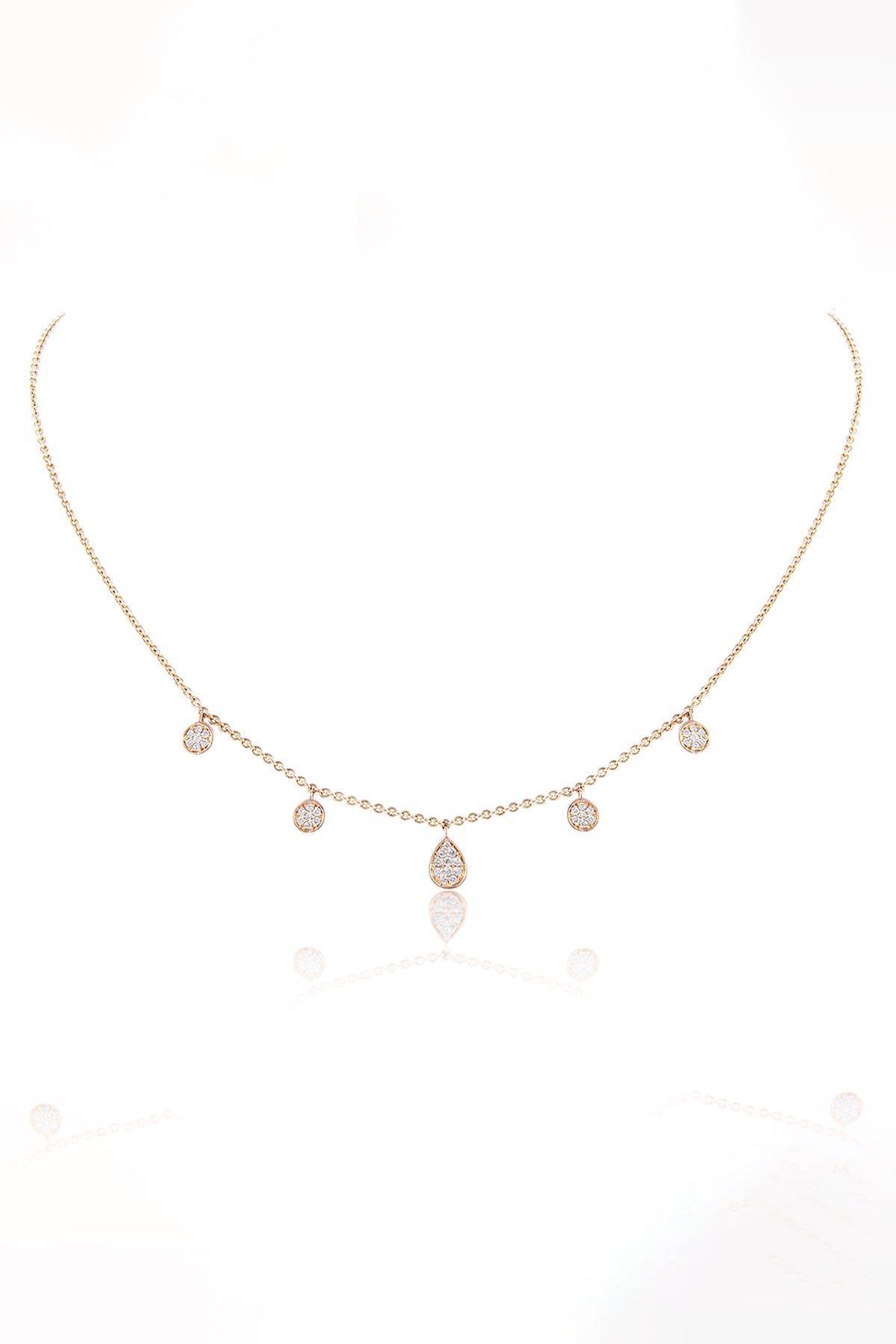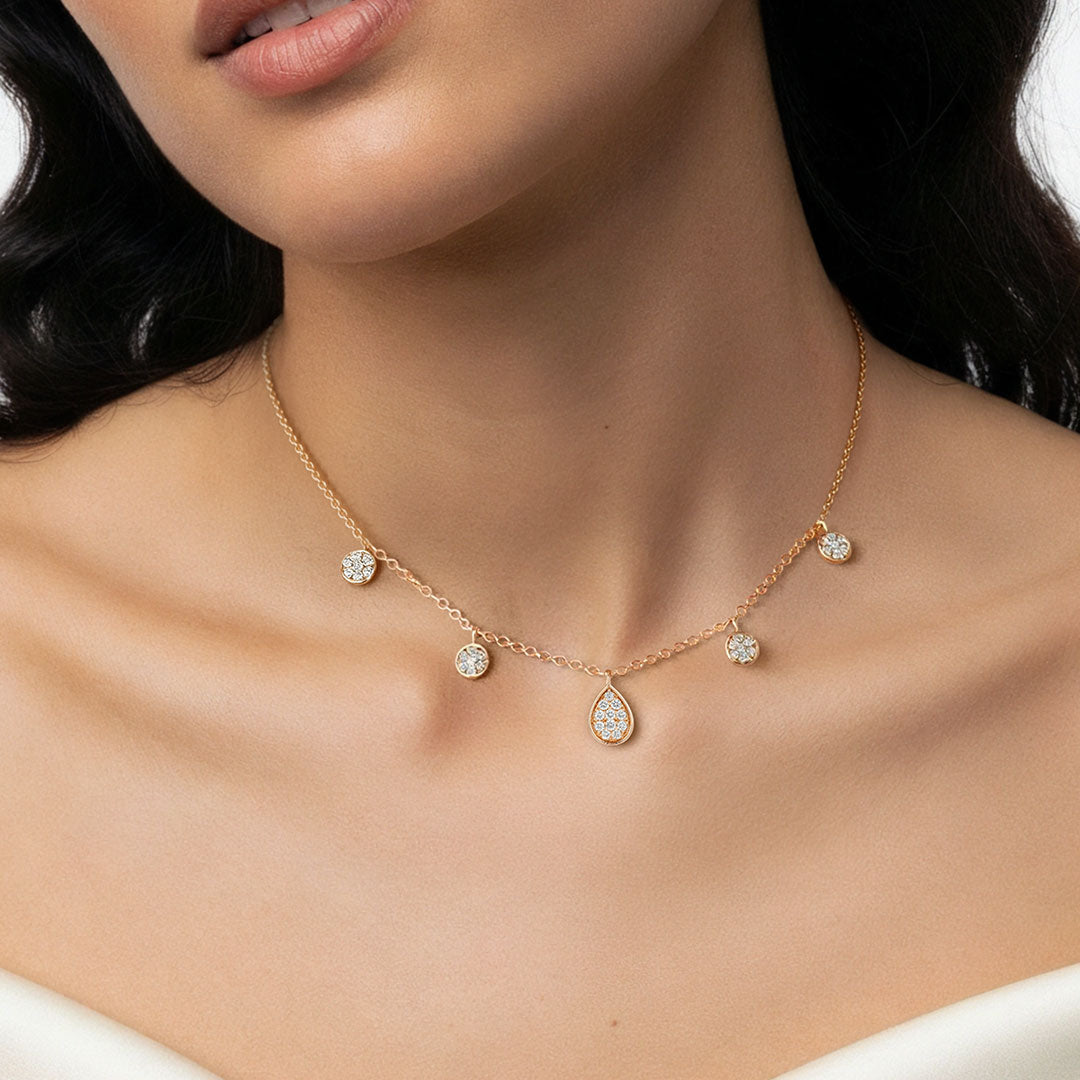 18 Kt yellow gold necklace with pear and round shaped drops, showcasing round brilliant-cut diamonds