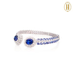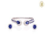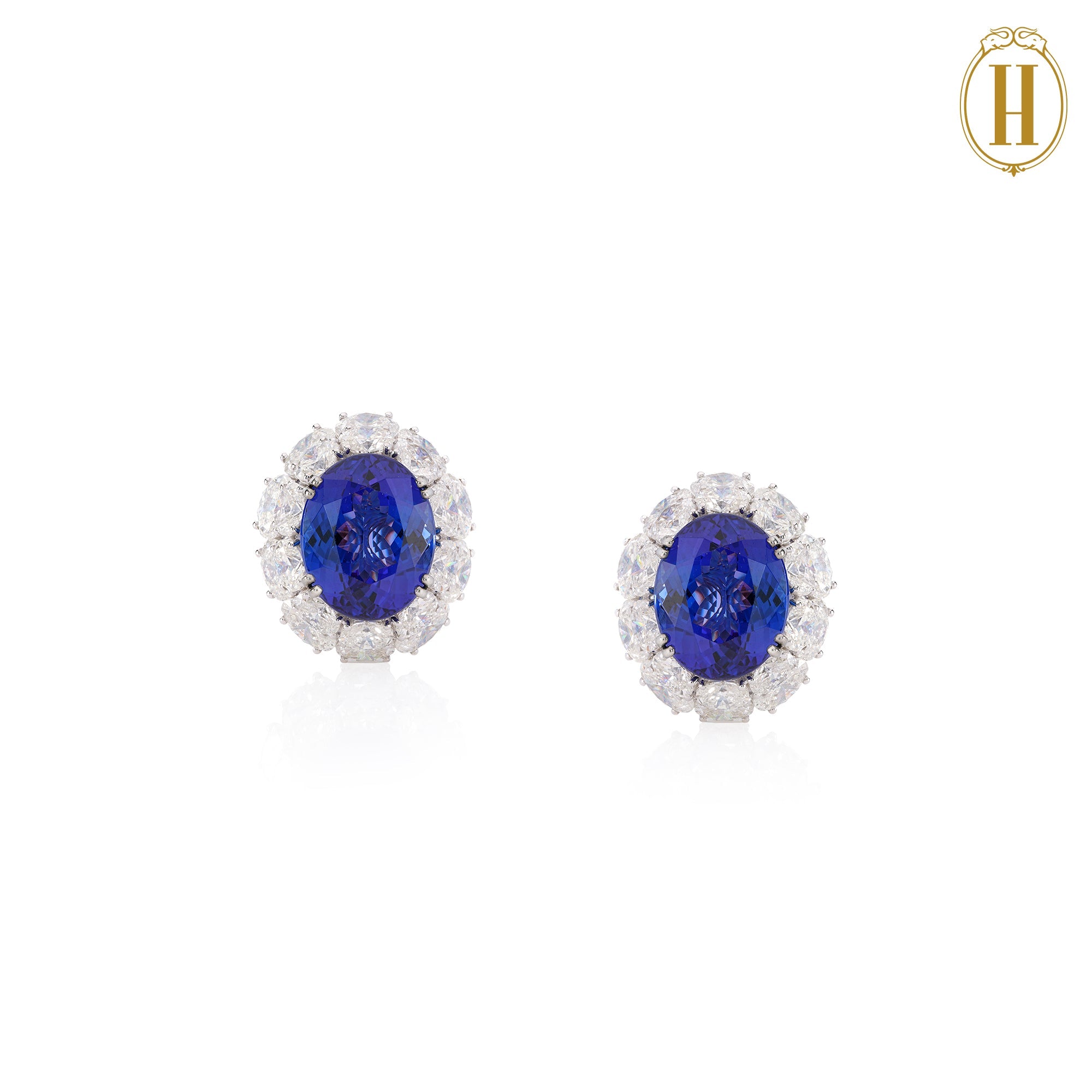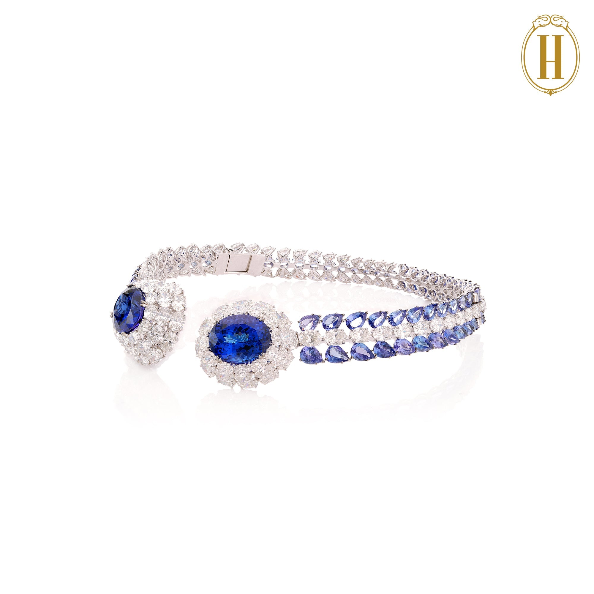 A choker set showcasing two large oval-shaped natural tanzanites, accompanied by GIA-certified solitaires and natural tanzanites in pear and oval shapes.