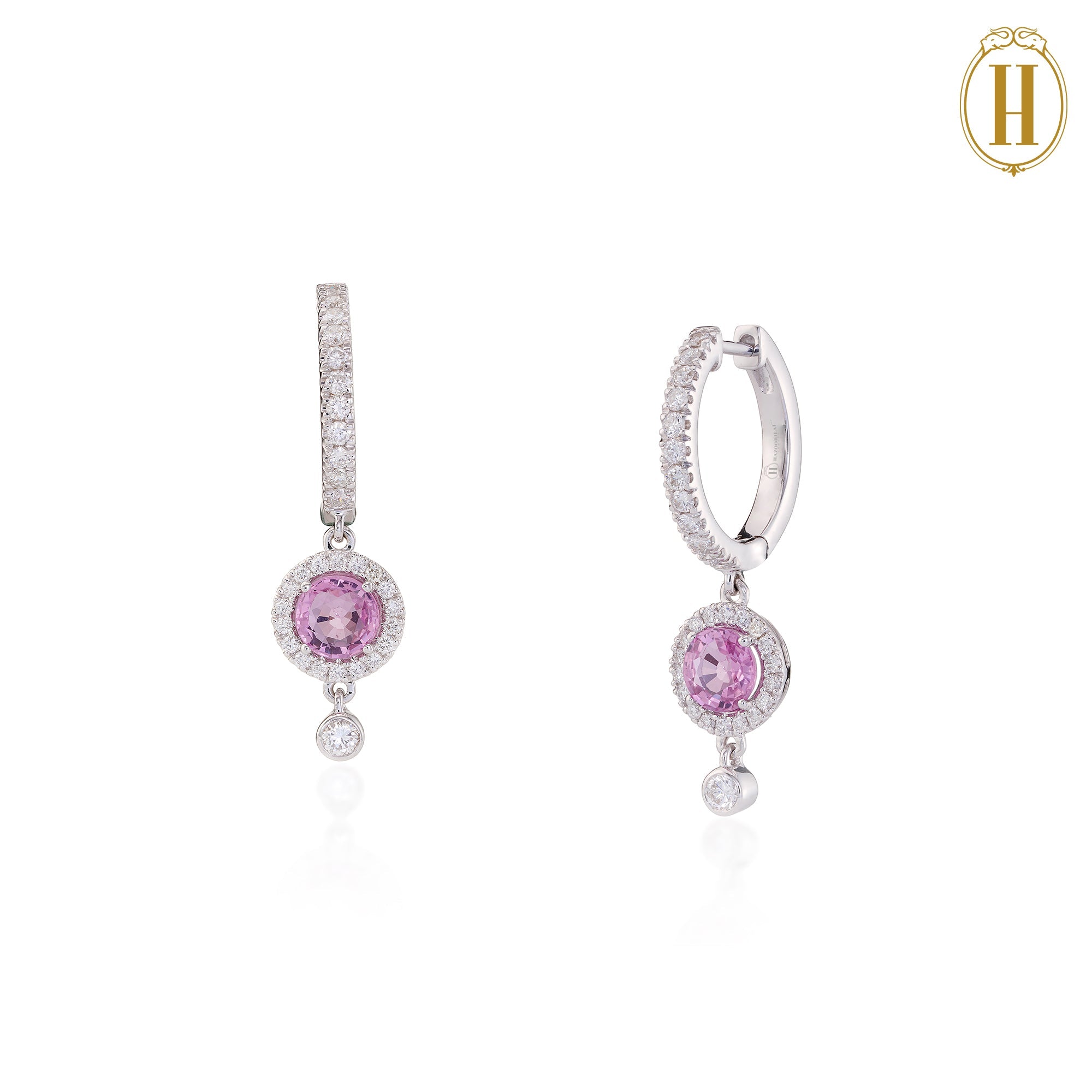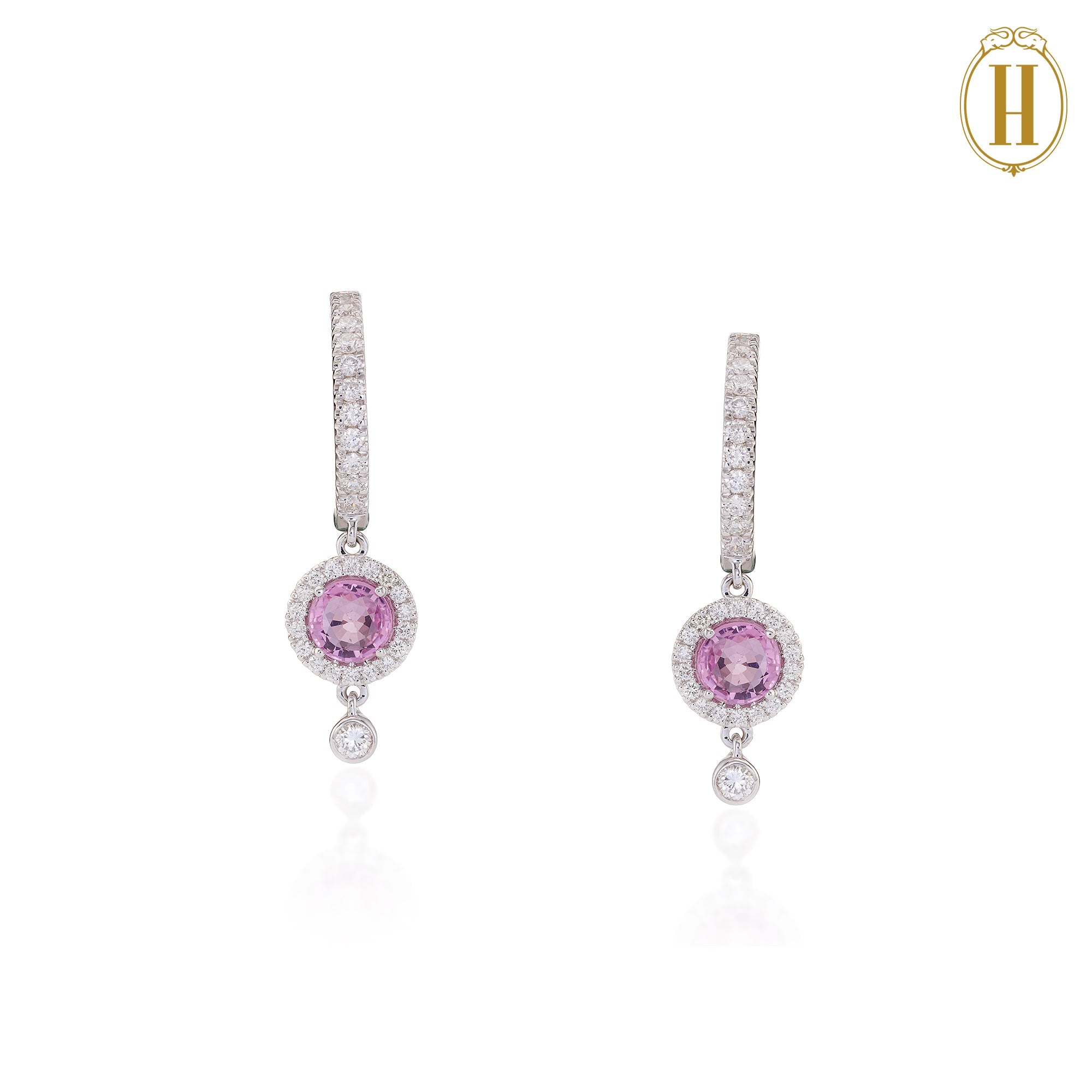 14KT yellow gold earrings with diamonds encrusted with pink sapphire.