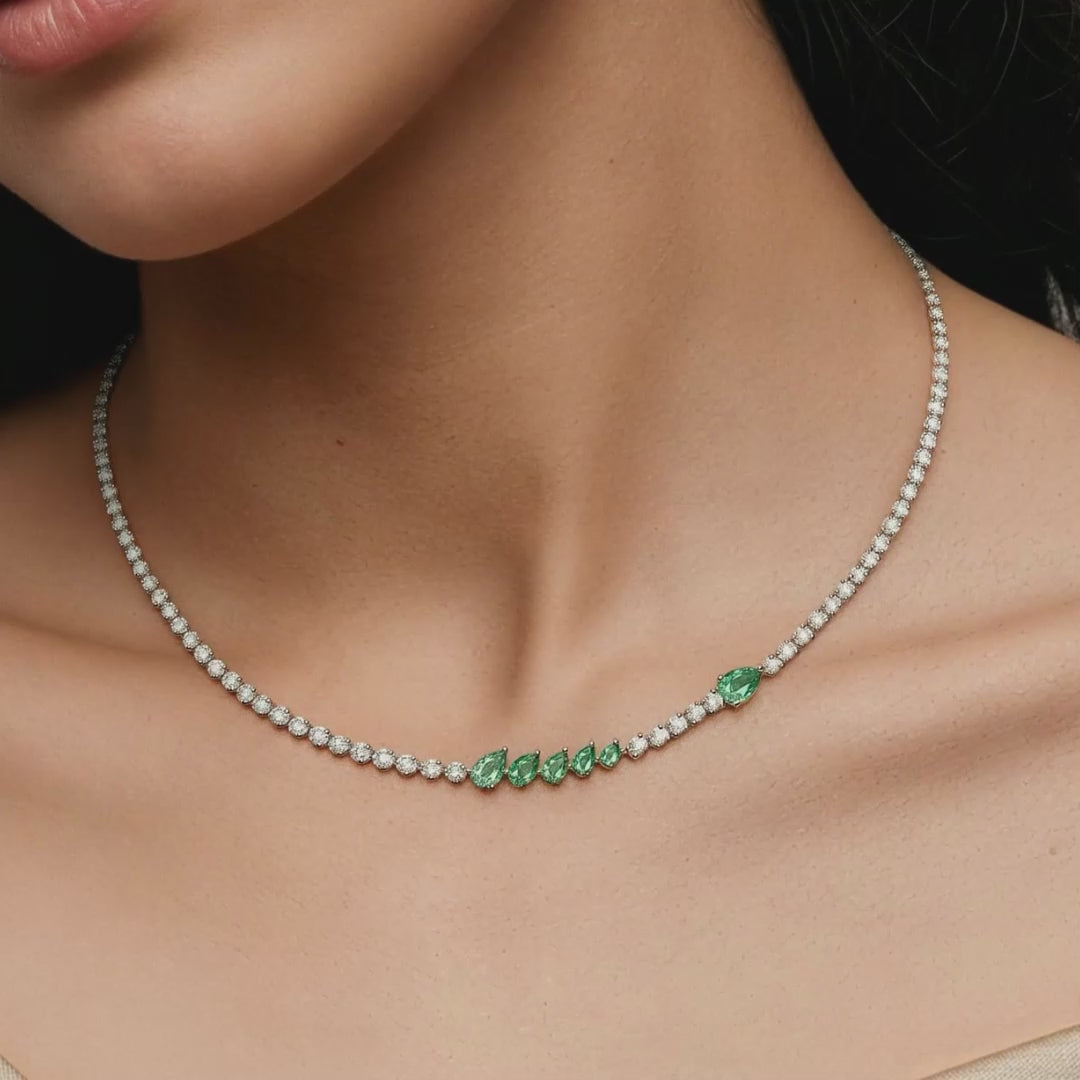 18 kt White gold necklace with round brilliant-cut diamonds and striking pear shaped Emeralds