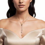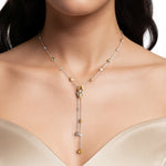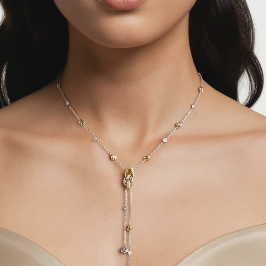 Elevate your style with this mixed metal lariat in yellow and white gold, featuring a knot design and a flowing, cascading drop with round brilliant-cut diamonds in a flush setting.