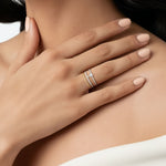 A unified stack of three rings in yellow gold, featuring oval and round brilliant cut diamonds